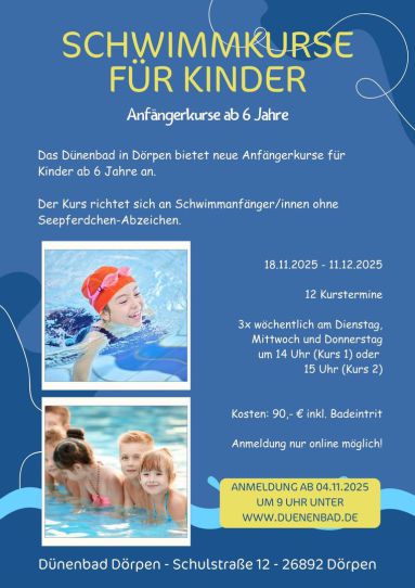 Neue Anfänger-Schwimmkurse für Kinder ab 6 Jahren starten am 18.11.2025.